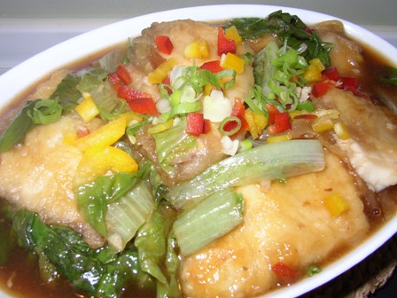 接著放入1. 煎(炸)好的魚片 淋上一點點香油