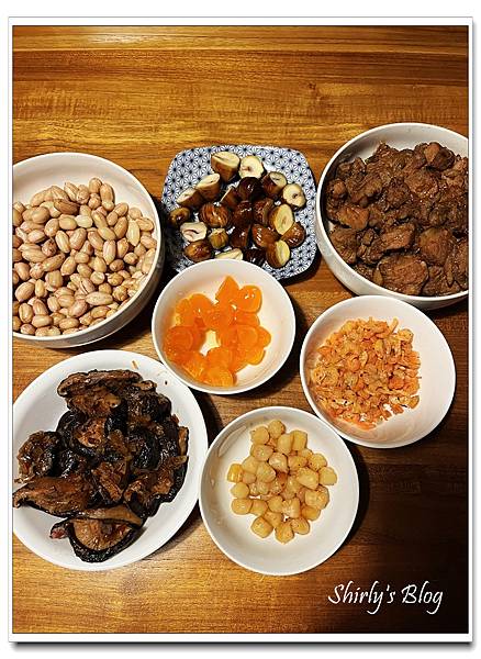 - 8.炒香菇:香菇先洗淨泡軟,擠乾水分,取一乾淨鍋子乾鍋炒香即可,不要放油,中小火烘出香味,加入1/4炸好的紅蔥頭一起拌炒、2匙醬油、少許胡椒粉、少許水,滷煮備用。